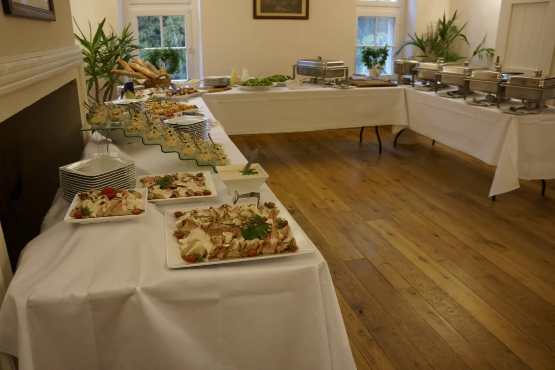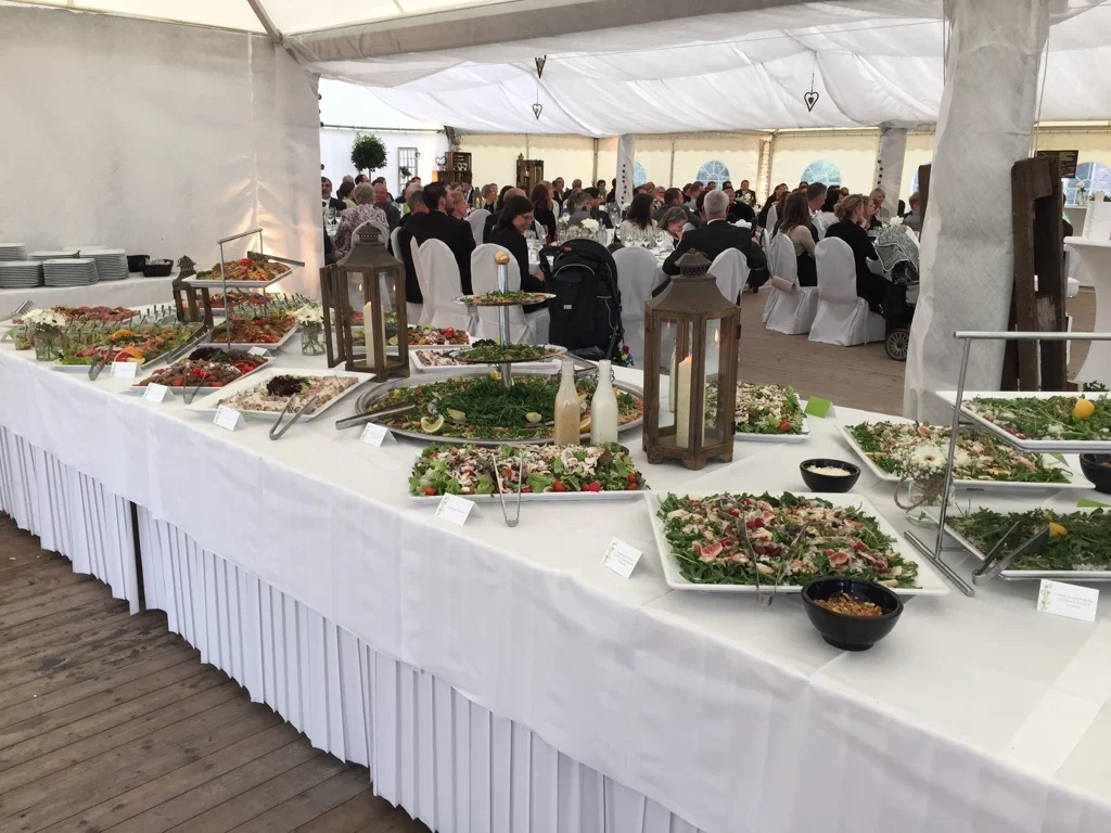 Bei größeren Gesellschaften sollten diese Bereiche noch größer vorbereitet werden. Für die Vorspeise ca. 6m x 1,5m und für den Hauptgang ca. 5m x 0,75m.
